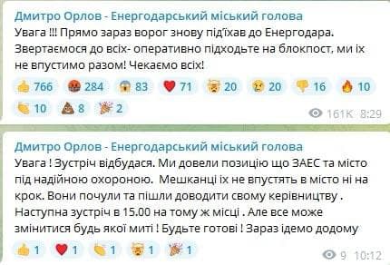 "Встреча состоялась. Мы донесли свою позицию, что ЗАЭС и город под надежной охраной. Местные жители их не впустят в город ни на шаг. Они услышали и пошли докладывать своему руководству. Следующая встреча в 15:00 на том же месте. Но все может измениться в любой момент!" - заявил мэр Энергодара.