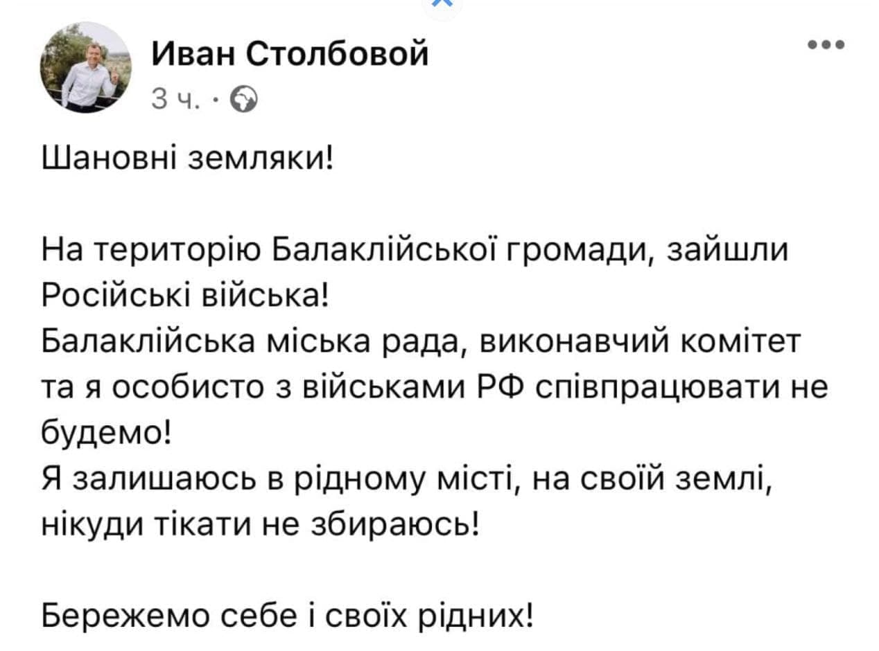 "Дорогие земляки! Русские войска вошли на территорию Балаклейской общины! Балаклейский горсовет, исполком и я лично не будем сотрудничать с войсками РФ! Остаюсь в родном городе, на своей земле, никуда не убегу! Берегите себя и своих родных!" = написал Столбовой.