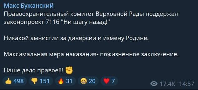"Правоохранительный комитет Верховной Рады поддержал законопроект 7116 "Ни шагу назад!". Никакой амнистии за диверсии и измену Родине. Максимальная мера наказания- пожизненное заключение", - говорится в сообщении.