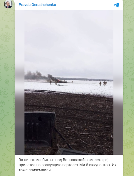 "За пилотом сбитого под Волновахой самолета рф прилетел на эвакуацию вертолет Ми-8 оккупантов. Их тоже приземлили", - написал Геращенко и опубликовал фото с места событий.