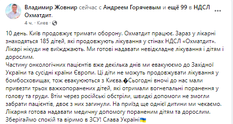 "Часть онкологических пациентов уже несколько дней мы эвакуируем в западную Украину и соседние страны Европы. Эти дети не могут продолжать лечение в бомбоубежищах, поэтому эвакуируются из Киева", - подытожил Владимир Жовнир.