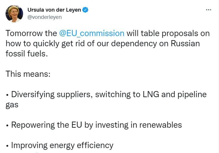 "Это означает: диверсификация поставщиков, переход на СПГ и трубопроводный газ, модернизация ЕС за счет инвестиций в возобновляемые источники энергии, повышение энергоэффективности", - написала глава ЕК.