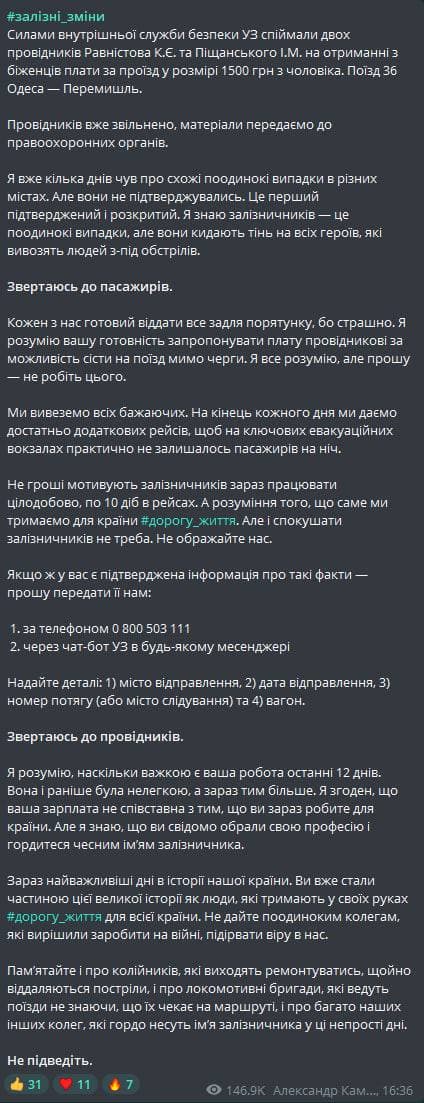 Глава УЗ Александр Камышин сообщил, что внутренняя безопасность "Укрзализници" задержала двоих проводников - Равнистова и Пищанского на получении взяток от беженцев.