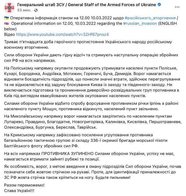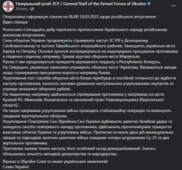 • В северном направлении украинские защитники удерживают оборону города Чернигов. Принимаются меры по сдерживанию продвижения врага в направлении Киева.