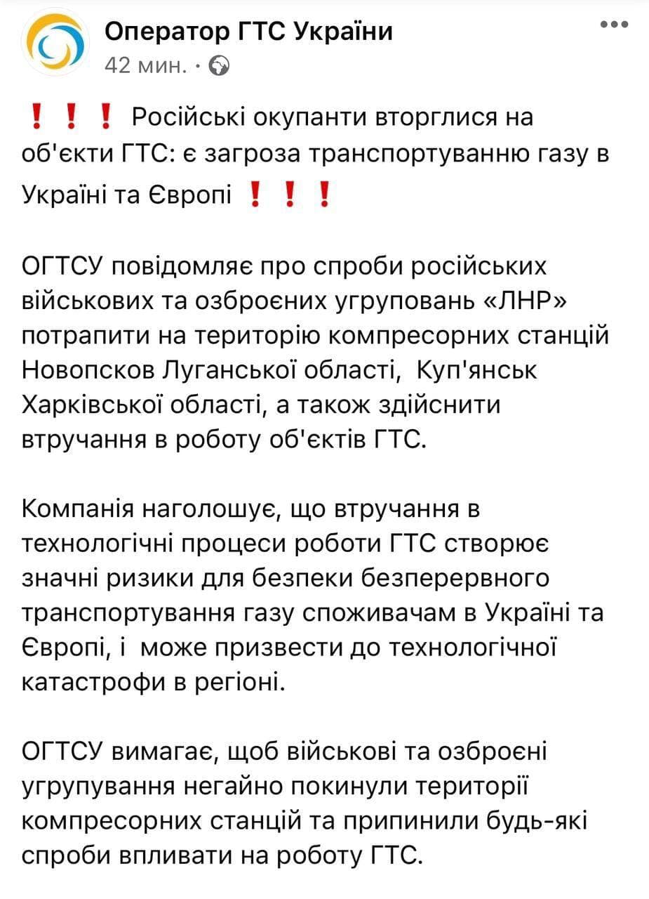 18.58 У Светлодарска (Донецкая область близ линии фронта) в ходе боев перебит газопровод высокого давления.