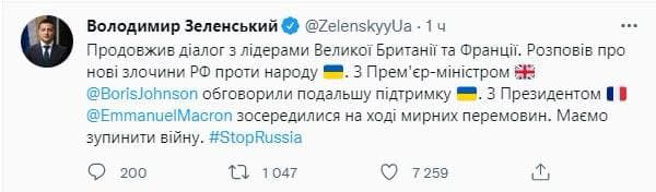 1.  Запад должен сделать всё, о чём просит Украина. "Сейчас мы видим беспрецедентное объединение западного мира. За что огромное спасибо нашим международным партнерам"