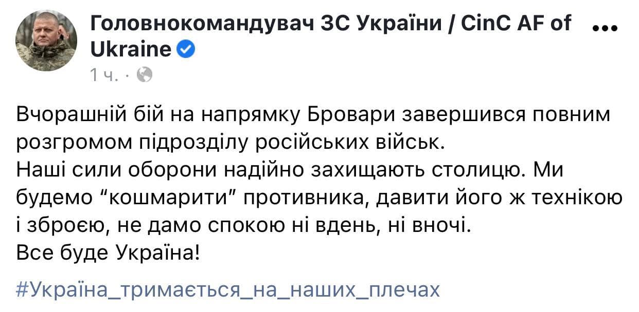 17:35 Главком ВСУ Валерий Залужный сообщил, что бой под Броварами завершился разгромом подразделения противника. Напомним, российские войска наступают на Бровары, чтоб заблокировать Киев с востока.