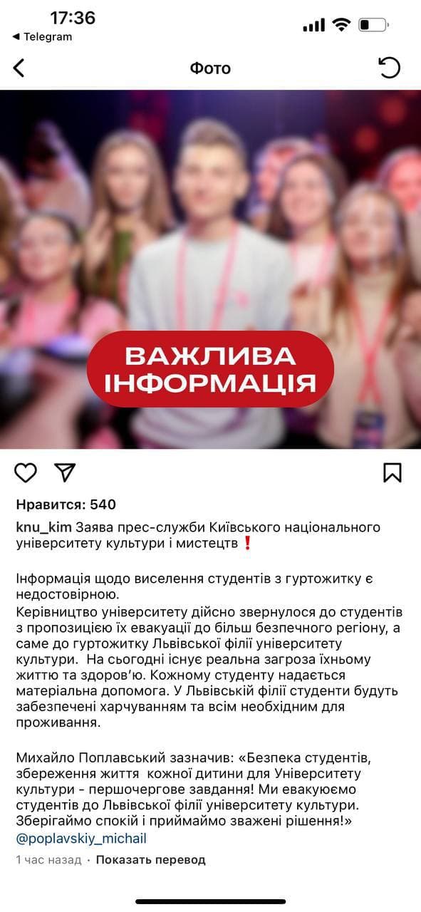 17:40 В Университета культуры написали, что информация о выселении студентов из общежития является недостоверной. Мол им предлагали перебазироваться в более безопасное место - во Львовскую филию вуза.