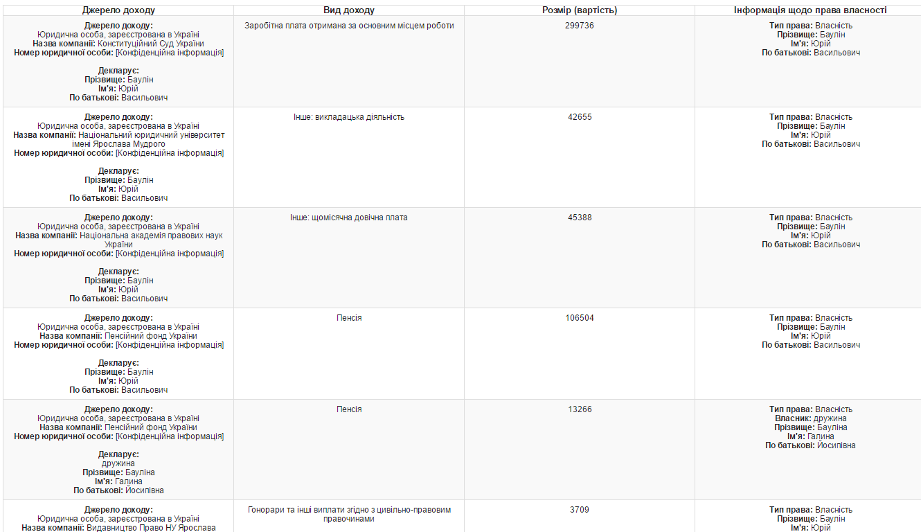 Глава Конституционного суда Украины Юрий Баулин указал в своей электронной декларации две квартиры, которыми владеет совместно с супругой, садовый домик, кооперативный гараж, а также совокупный годовой доход на сумму более 500 тыс. грн.