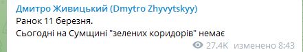 11.30 Губернатор  Дмитрий Живицкий о "зеленом коридоре" из Сум - "Переговоры продолжаются. Кто принял решение о выезде - будьте готовы сделать это быстро, в любой день".