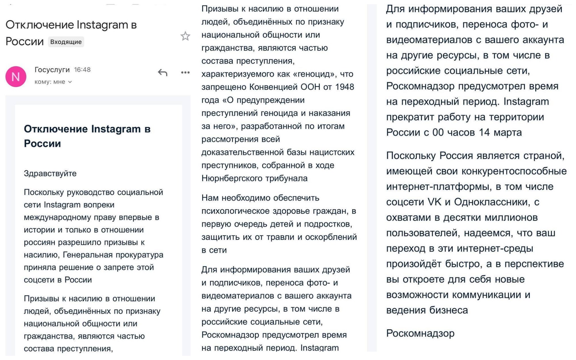 19.04 Всем, кто зарегистрировал свой инстаграм в России, пришли письма об отключении приложения по решению Роскомнадзора.