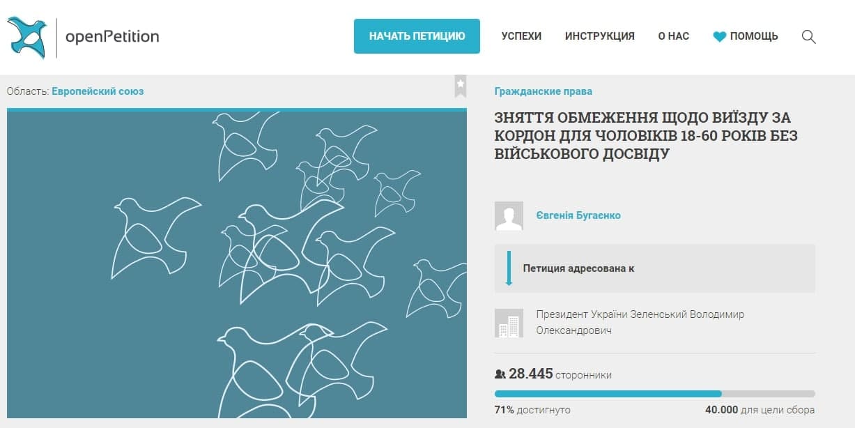 22.42 На одной из крупнейших в Европе платформ цифровой демократии - сайте Openpetition - появилась злободневная петиция Зеленскому. Она требует отменить ограничения по выезду за границу для мужчин 18-60 лет без военного опыта.