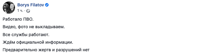 "Работала ПВО. Видео, фото не выкладываем. Все службы работают. Ждем официальной информации. Предварительно жертв или разрушений нет", - написал он.