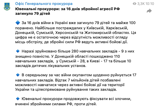"За 16 дней войны в Украине уже погибли 79 детей и почти 100 ранены. Больше всего пострадавших в Киевской, Харьковской, Донецкой, Сумской, Херсонской и Житомирской областях. Эта цифра не является окончательной из-за отсутствия возможности досмотра мест обстрела, где вооруженные силы РФ ведут активные боевые действия", - говорится в сообщении.