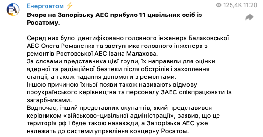 "Вчера на Запорожскую АЭС прибыло 11 гражданских лиц из Росатома. Среди них были идентифицированы главный инженер Балаковской АЭС Олег Романенко и заместитель главного инженера по ремонтам Ростовской АЭС Иван Малахов. По словам представителя этой группы, их направили для оценки ядерной и радиационной безопасности после обстрелов и захватов станции, а также предоставления помощи с ремонтами", - говорится в сообщении.