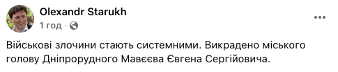 "Военные преступления становятся системными. Похищен городской глава Днепрорудного Мавеев Евгений Сергеевич", - говорится в сообщении.