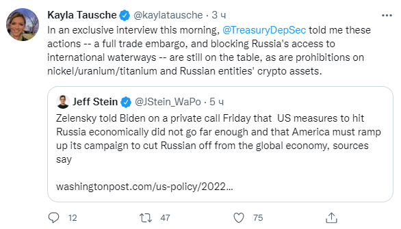 Об этом сообщила со ссылкой на замминистра финансов Соединенных Штатов Уолли Адемейо корреспондент телеканала CNBC Кайла Тауш 14 марта в своем Twitter.