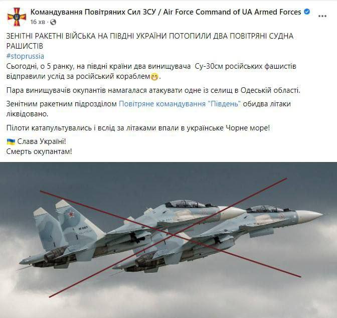По его словам, речь и самолетах Су-30 и их экипаже. Один из них украинская ПВО сбила на подлете, другой - успел развернуться в направлении оккупированного Крыма, но не долетел до базы - сработала также украинская ПВО.