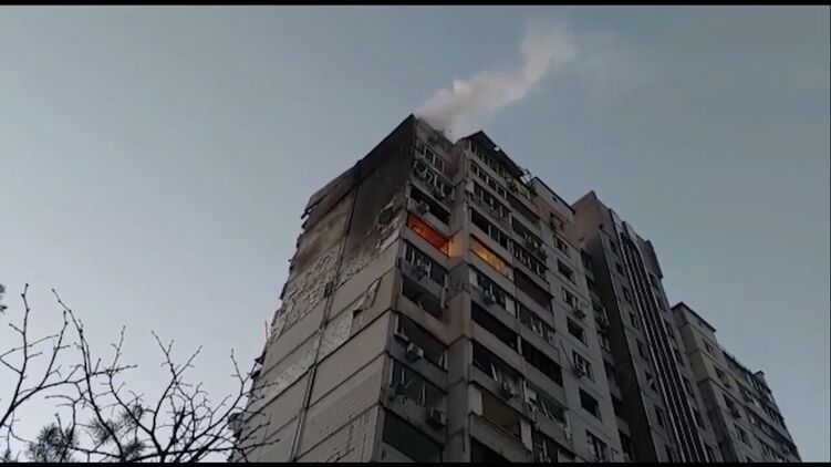 В Киеве обломки сбитой ракеты упали на многоэтажку. Начался пожар, есть погибший. Фото, видео