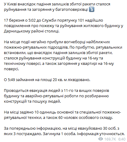 Утром в четверг, 17 марта, в Киеве в результате падения остатков сбитой ракеты произошло разрушение и возгорание в многоэтажке в Дарницком районе.