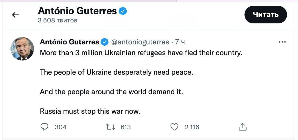 "Россия должна прекратить войну сейчас", - написал Гутерриш.