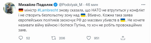 На слова Ламбрехт отреагировал советник главы ОП Михаил Подоляк у себя в твиттере, назвав ее слова провокационными и "убийственными".