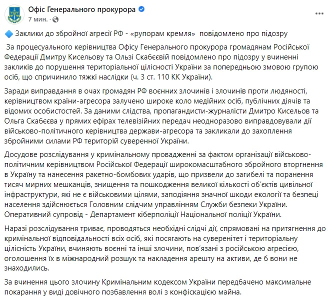 "Ради оправдания в глазах граждан РФ военных преступлений и преступлений против человечности, руководством страны-агрессора привлечен широкий круг медиа, публичных деятелей и известных личностей. По данным следствия, пропагандисты-журналисты Дмитрий Киселев и Ольга Скабеева в прямых эфирах телевизионных передач неоднократно оправдывали действия военно-политического руководства государства-агрессора и призывали к захвату вооруженными силами РФ территорий суверенной Украины", - говорится в сообщении.