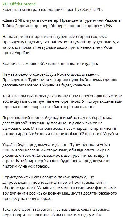 Глава Министерства иностранных дел Украины Дмитрий Кулеба заявил, что нет никакого консенсуса с Россией по поводу упомянутых президентом Турции четырёх пунктов и добавил, что единственным государственным языком в Украине есть и будет украинский.