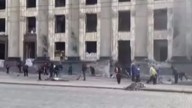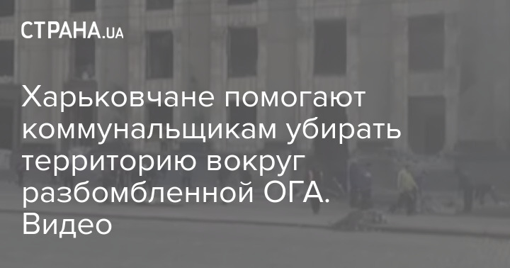 Жители Харькова вышли помочь коммунальщикам бороться с последствиями обстрелов. Видео уборки территории вокруг здания разбомбленной ракетными ударами Харьковской ОГА публикуют местные телеграм-каналы.