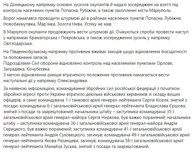 На Донбассе основные бои идут за Мариуполь, Рубежное и Попасную. Губернатор Луганской области говорит о постоянных обстрелах Северодонецка, Лисичанска, Попасной и Рубежного. Жители Донецкой области сообщают об обстрелах Авдеевки, Песок и боях в районе Марьинки. В Киевской области войска противника накапливаются в районе Чернобыля.