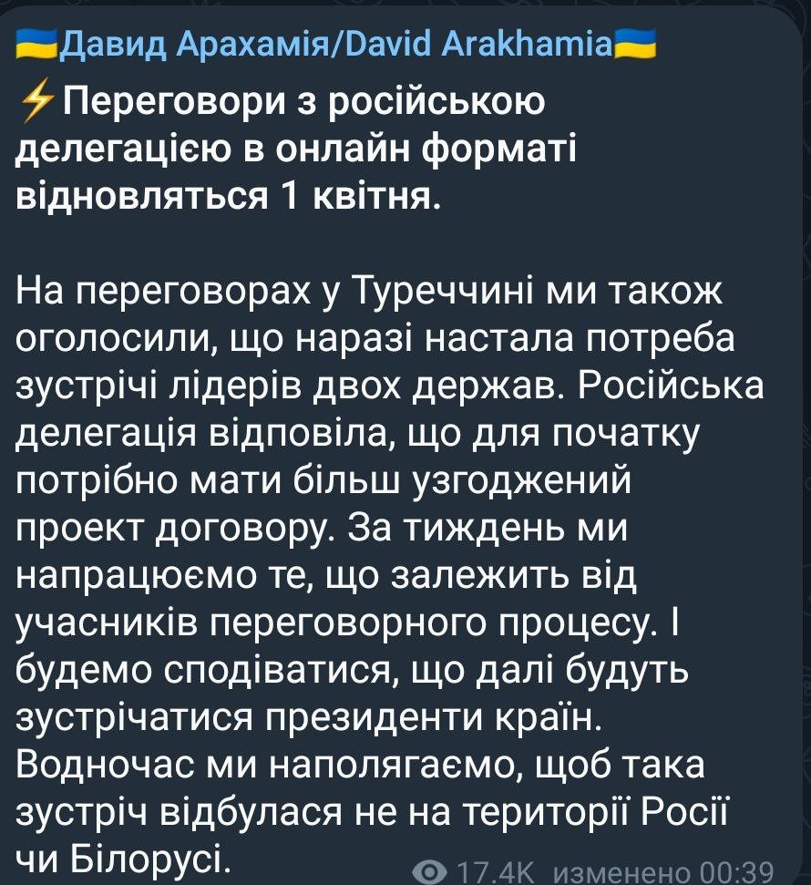 Как заявил представитель украинской делегации Давид Арахамия, предстоящую неделю стороны будут обсуждать представленный Украиной проект мирного договора.
