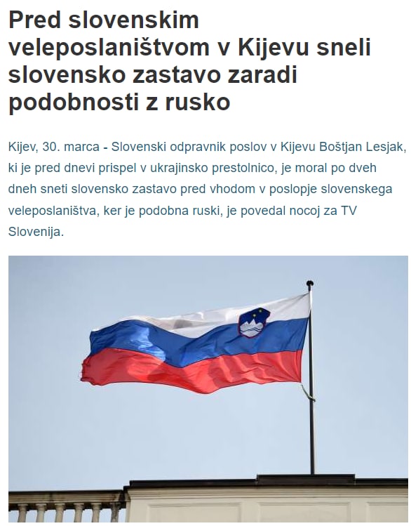 "Мы с гордостью подняли словенский и европейский флаги, они красиво развевались на ветру. Но утром приехали представители Национальной гвардии, а затем полиции. Они спросили, можем ли мы снять словенский флаг, потому что он слишком похож на российский", - рассказал Лесьяк.