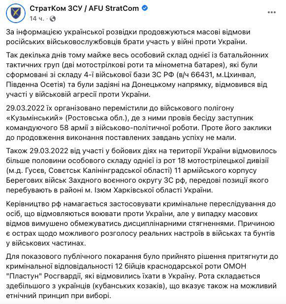 21.36 В вечерней сводке Генштаба СУ говорится, что в России родственники погибших на войне в Украине военнослужащих подают иски в суд против российского военного руководства.