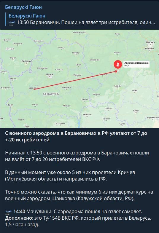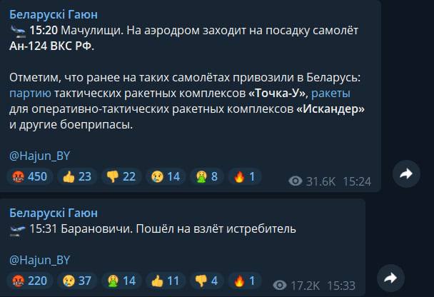 19.50 Генштаб ВСУ также сообщает, что россияне перебрасывают в аэропорт Гомеля наёмников с ближнего востока и перевозят в Беларусь новые ракетные установки Искандер.