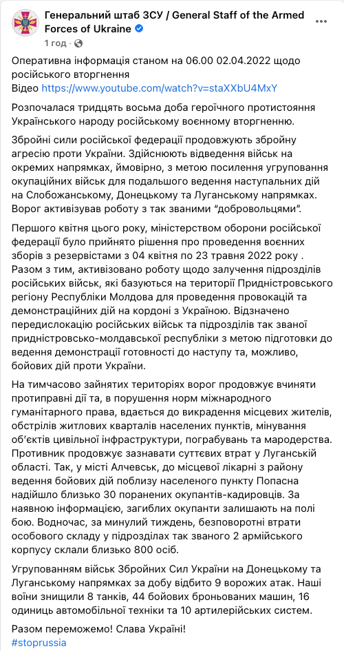 В субботу, 2 апреля, Генеральный штаб Украины сообщил, что российско-оккупационные войска продолжают уходить из-под Киева, чтобы, предположительно, усилить позиции на юго-востоке страны. Соответствующий пост был опубликован в Facebook.