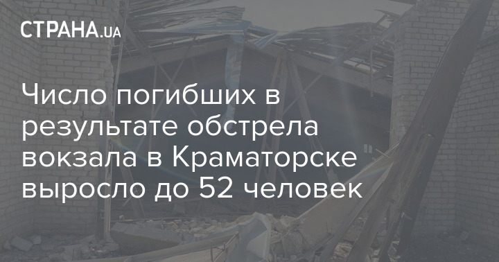 Число погибших в результате обстрела железнодорожного вокзала в Краматорске 8 апреля возросло до 52 человек, раненых – до 109. Среди погибших пятеро детей.