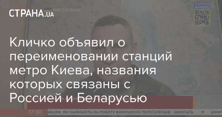 Мэр Киева Виталий Кличко анонсировал переименование станций метро Киева, названия которых связаны с Россией и Беларусью.