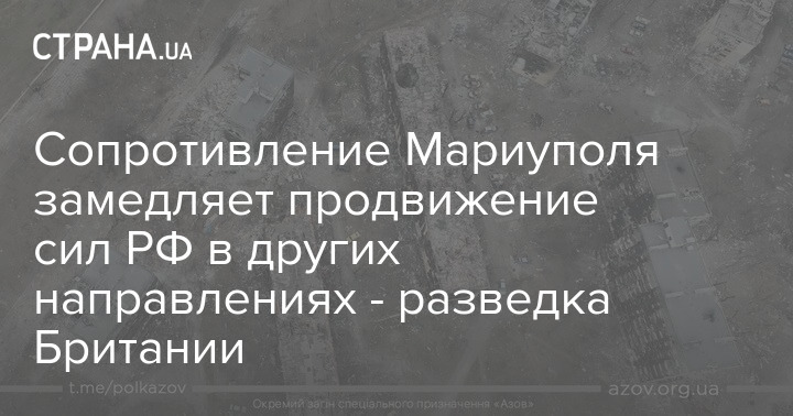 Разведка Британии сообщает, что российское командование будет обеспокоено тем, сколько времени потребуется на взятие Мариуполя. По ее данным, согласованное украинское сопротивление подвергло российские силы серьезному испытанию и отвлекло людей и технику, замедлив продвижение России в других направлениях.