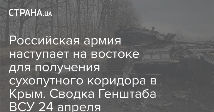 В Генеральном штабе Вооруженных сил Украины опубликовали оперативную вечернюю сводку с фронта боевых действий по состоянию на 18:00 24 апреля, в которой говорится, что российские войска продолжают наступление на востоке для установления полного контроля над территорией Донецкой и Луганской областей и обеспечения сухопутного пути в временно оккупированный Крым.