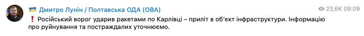 "Российский враг ударил ракетами по Карловке – прилет в объект инфраструктуры. Информацию о разрушениях и пострадавших уточняем", - сообщил Лунин.