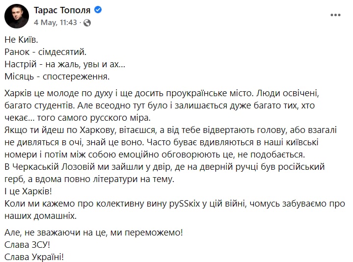 Лидер группы "Антитела", служащий сейчас в рядах ВСУ Тарас Тополя, написал пост о Харькове. Он заявил, что в городе, где он сейчас находится, "очень много тех, кто ждет того самого русского мира".