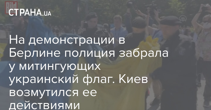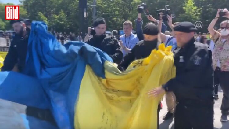 В Берлине сегодня на демонстрации в честь дня окончания Второй мировой войны полиция отобрала украинский флаг и свернула его. Видео с тем, как правоохранители сворачивают и отбирают большое полотно, которое держали несколько человек, опубликовало немецкое издание BILD.
