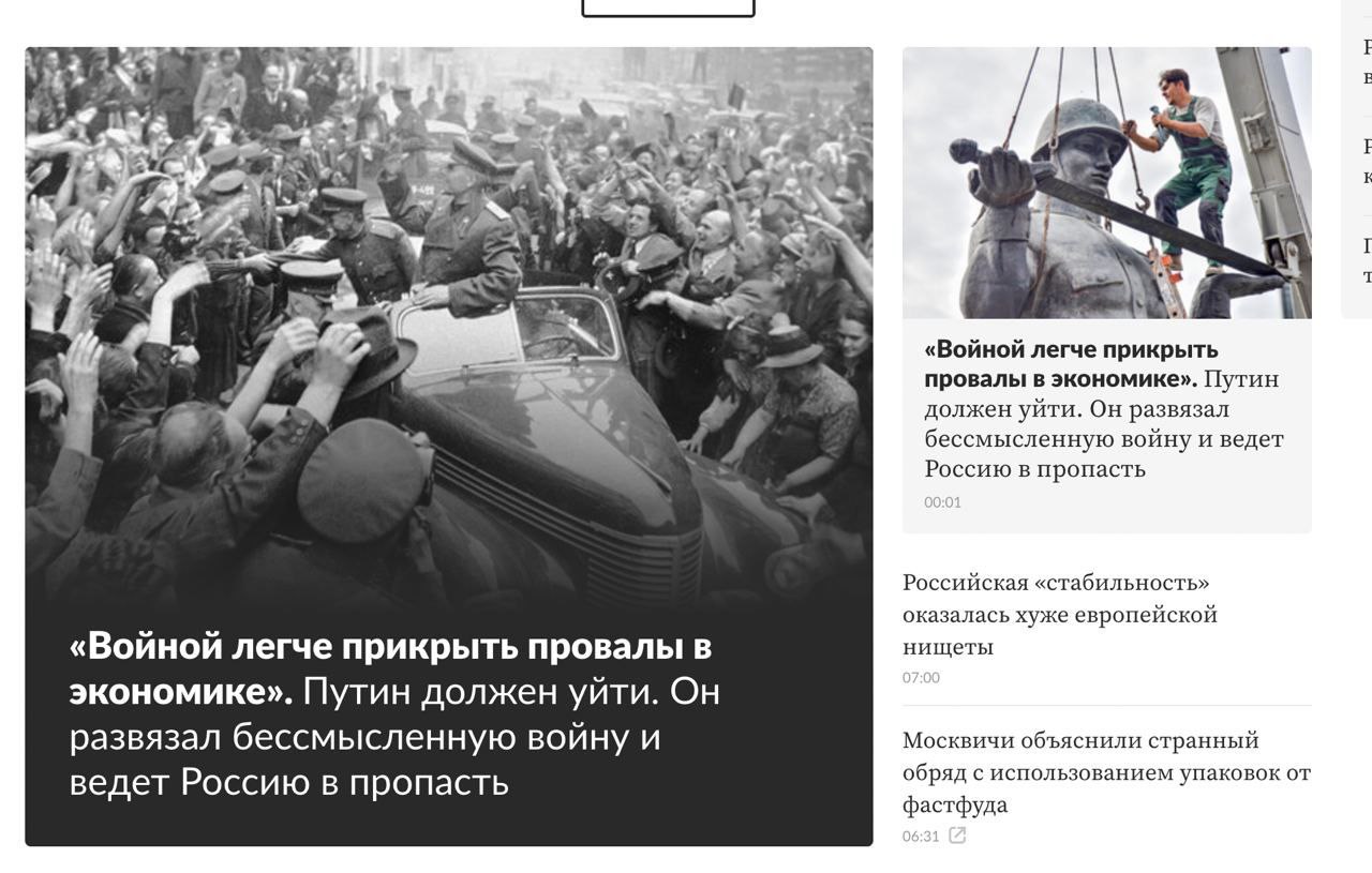 Так, в частности, утром на сайте были опубликованы материалы с заголовками: "Войной легче прикрыть провалы в экономике". Путин должен уйти. Он развязал бессмысленную войну и ведет Россию в пропасть", "Россия бросает трупы своих солдат в Украине", "Путинская Россия презирает закон", "Путин оказался главным русофобом мира".