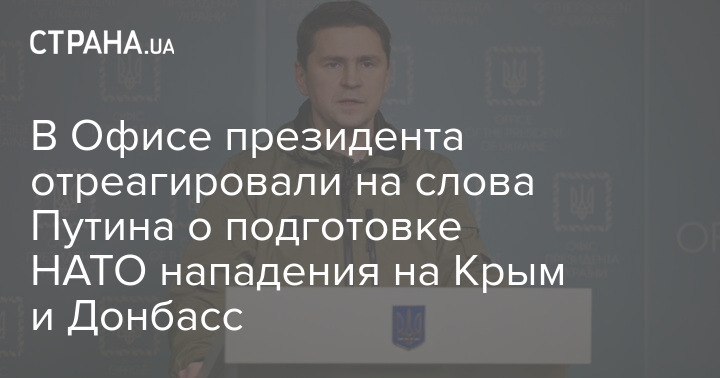 Советник главы Офиса президента Михаил Подоляк ответил на заявление президента РФ Владимира Путина о том, что НАТО и Украина якобы планировали нападение на Крым и Донбасс. Подоляк сообщил, что это не соответствует действительности.