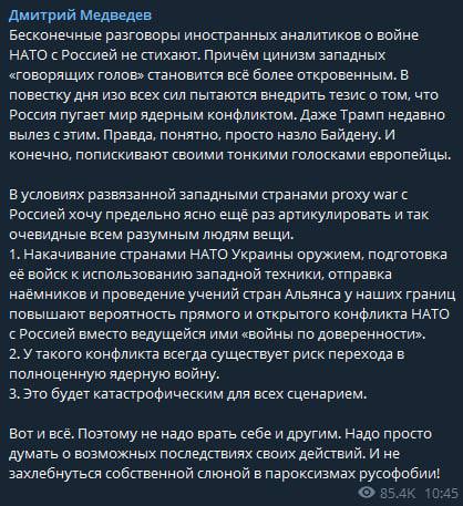 "Накачивание странами НАТО Украины оружием, подготовка её войск к использованию западной техники, отправка наёмников и проведение учений стран Альянса у наших границ повышают вероятность прямого и открытого конфликта НАТО с Россией вместо ведущейся ими "войны по доверенности". У такого конфликта всегда существует риск перехода в полноценную ядерную войну", - написал Медведев.