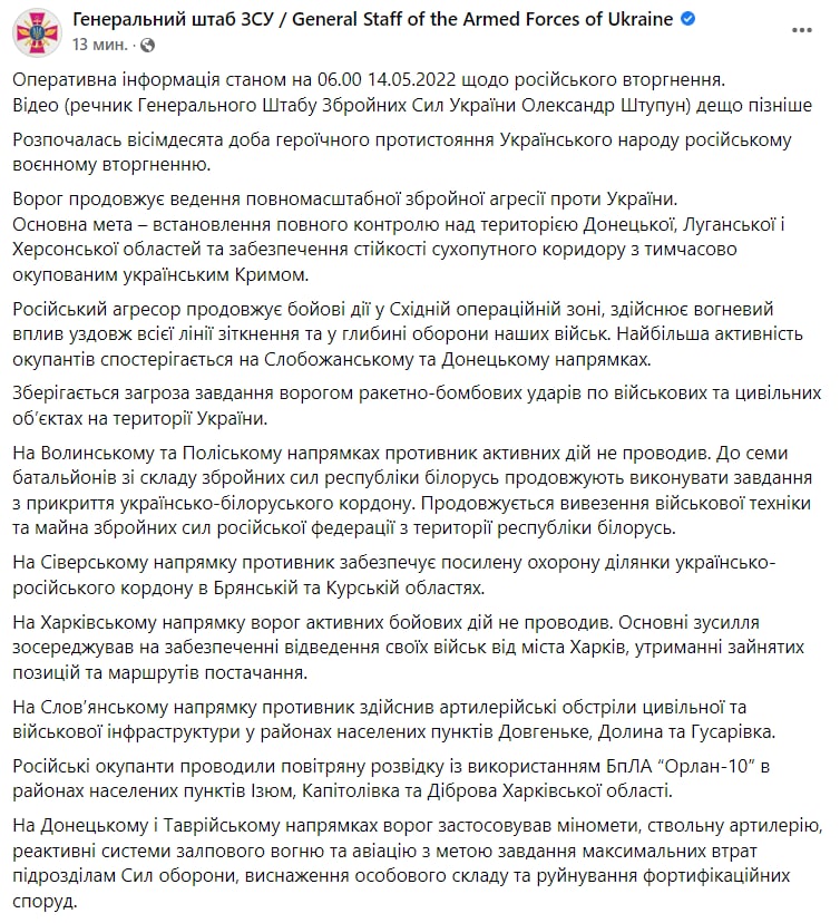 В субботу, 14 мая, идет уже 80-й день войны в Украине после российского вторжения 24 февраля.