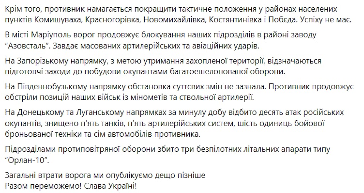 О наступлении на Изюм (о чем говорил губернатор Харьковщины) или взятии новых населенных пунктов (о чем сообщали журналисты) Генштаб не сообщает.