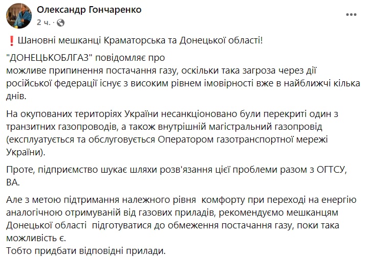 19.13 Мэр Краматорска сообщил, что в Донецкой области может полностью исчезнуть газ. И посоветовал закупать электроплиты.