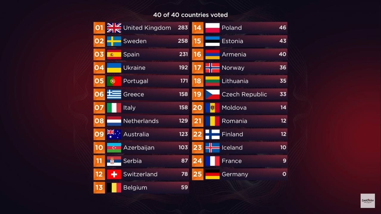 01.40 Турнирная таблица Евровидения-2022 по итогам голосования жюри.