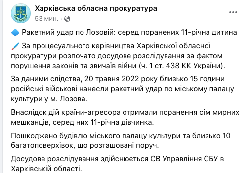 При процессуальном руководстве Харьковской прокуратуры уже начато досудебное расследование по  данному факту, статья о нарушении законов и обычаев войны.